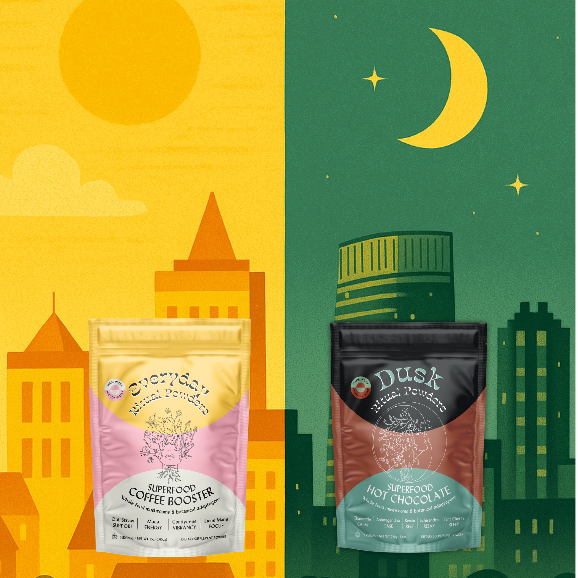 Functional mushrooms and adaptogens in the morning. Calming botanicals and Reishi at night. The bookends your routine has been missing.